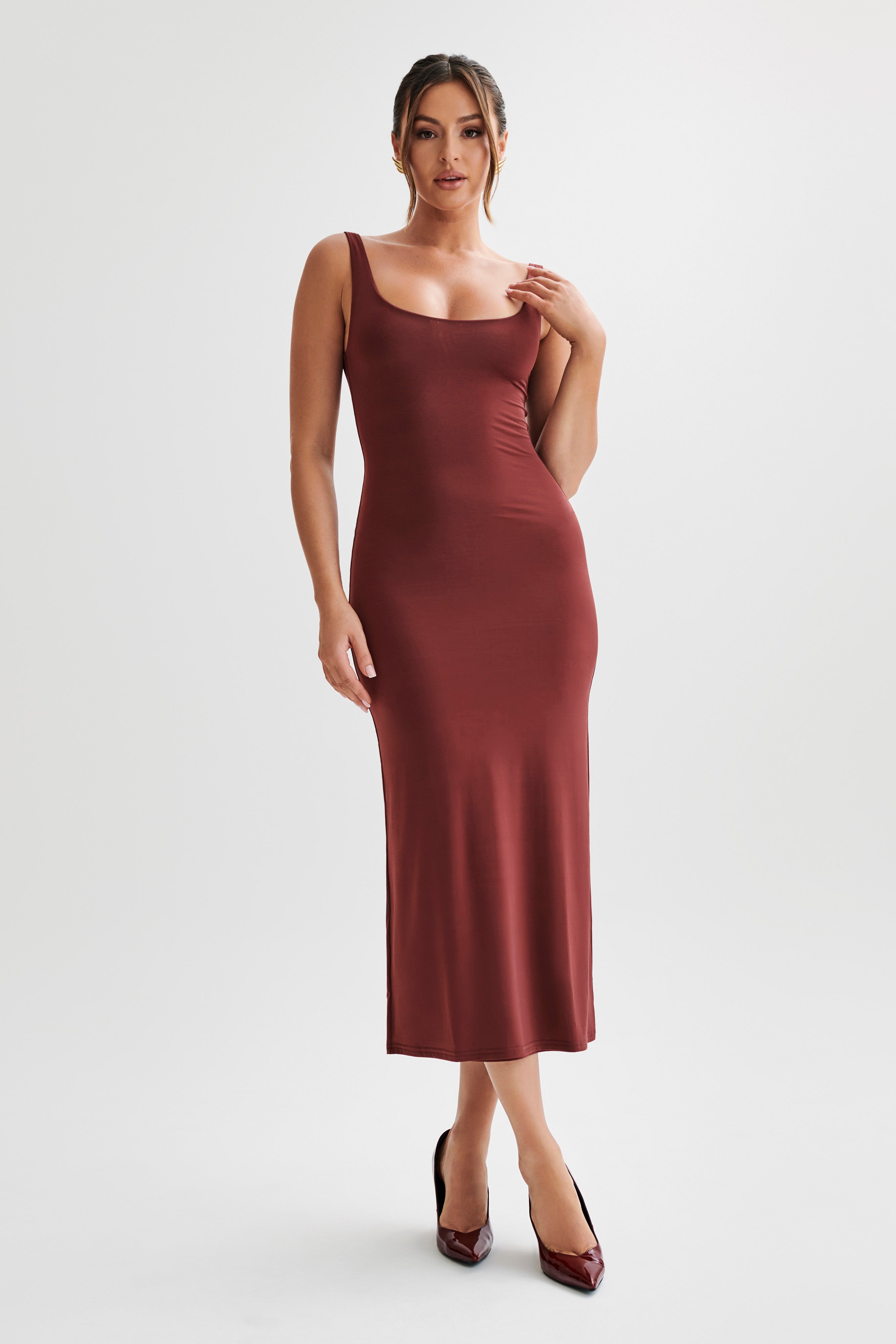 The AUGUSTINE Slinky Scoop Midi Dress is an elevated take on the classic midi. Crafted from our soft but supportive MESHKI blend fabric, it's designed to celebrate your form while the midi-length makes it an ideal option for day-to-night dressing. Layer with the Carver Suiting Coat or dress it down with the Rylee Oversized Denim Jacket to complete the look.