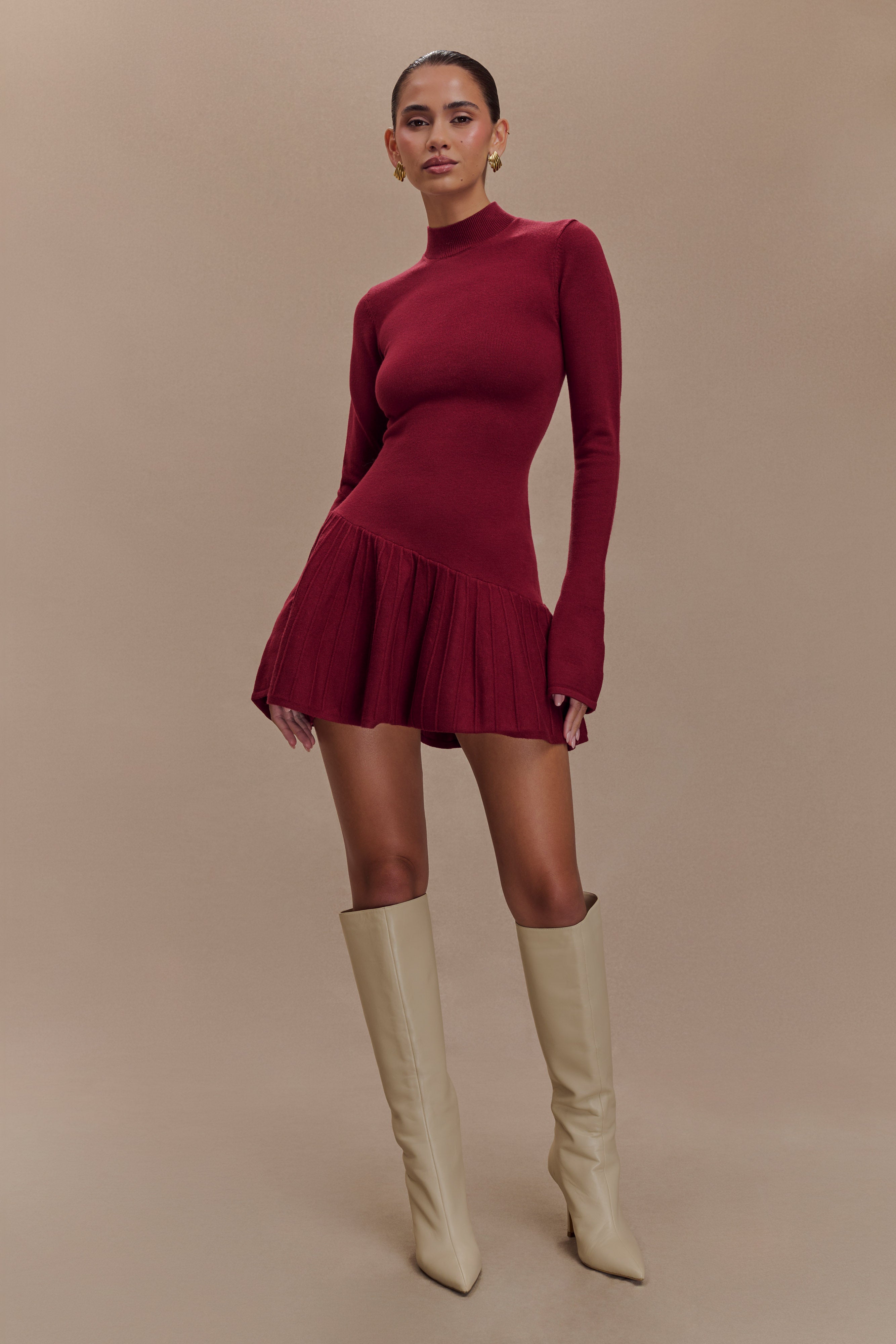 Introducing the BLAIR Knit Mini Dress with Pleats, a perfect blend of contemporary style and effortless elegance. This dress features a chic high neckline and long sleeves, ideal for transitional weather. The asymmetrical skirt panel seam adds a modern touch, while the pleated lower skirt creates beautiful movement. Flared sleeve hems enhance the unique silhouette, making this dress a standout choice. With its playful mini length, it pairs beautifully with your favourite ankle boots or heels, making it perfect for both day and evening wear.